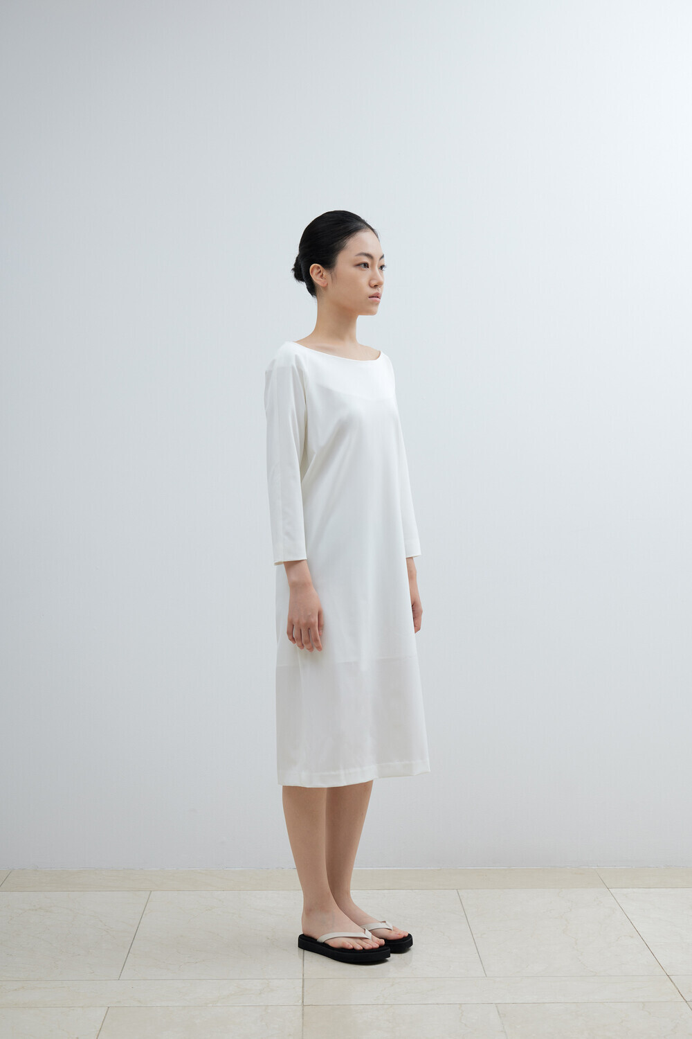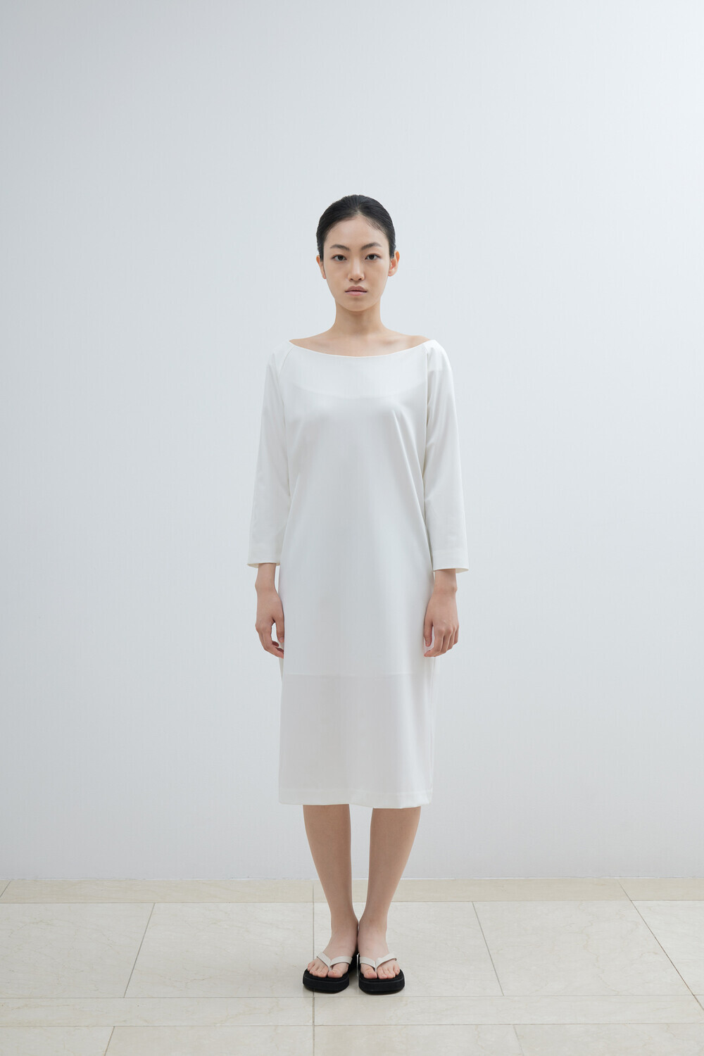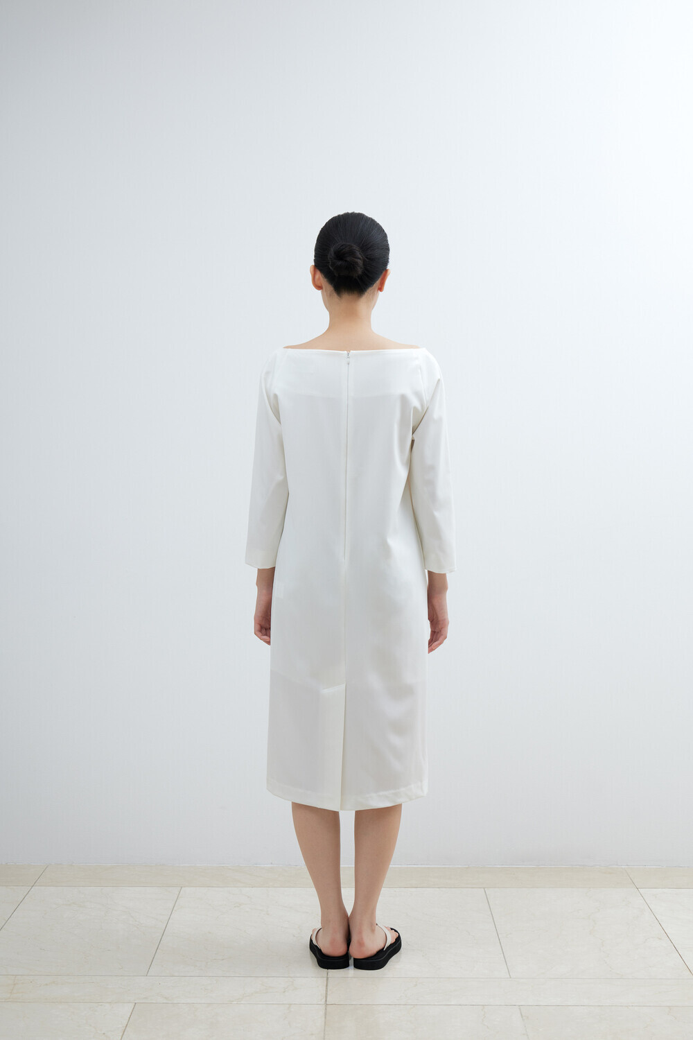 Description 넓게 펼쳐진 보트넥 라인이 돋보이는 드레스입니다. 미니멀하고 스탠다드한 실루엣에 9부 소매와 넥 라인으로 포인트 주어 우아한 분위기가 느껴집니다. 신축성이 느껴지는 드라이한 텍스처의 원단감으로 제작되었으며 안감 처리가 되어있어 비침 없이 착용하실 수 있습니다. 백라인 지퍼와 뒷 트임 디테일로 편안하게 착용되어집니다. 단독 착용 또는 팬츠 등 다양한 제품들과 레이어드해보기 좋습니다.