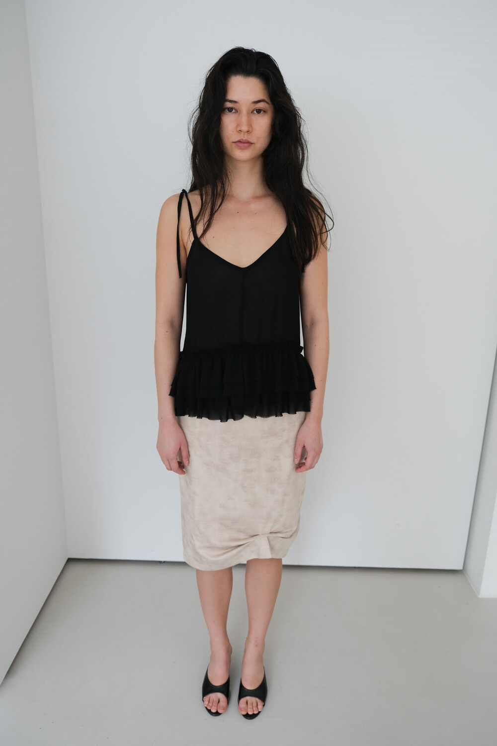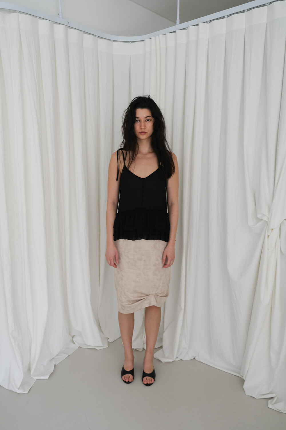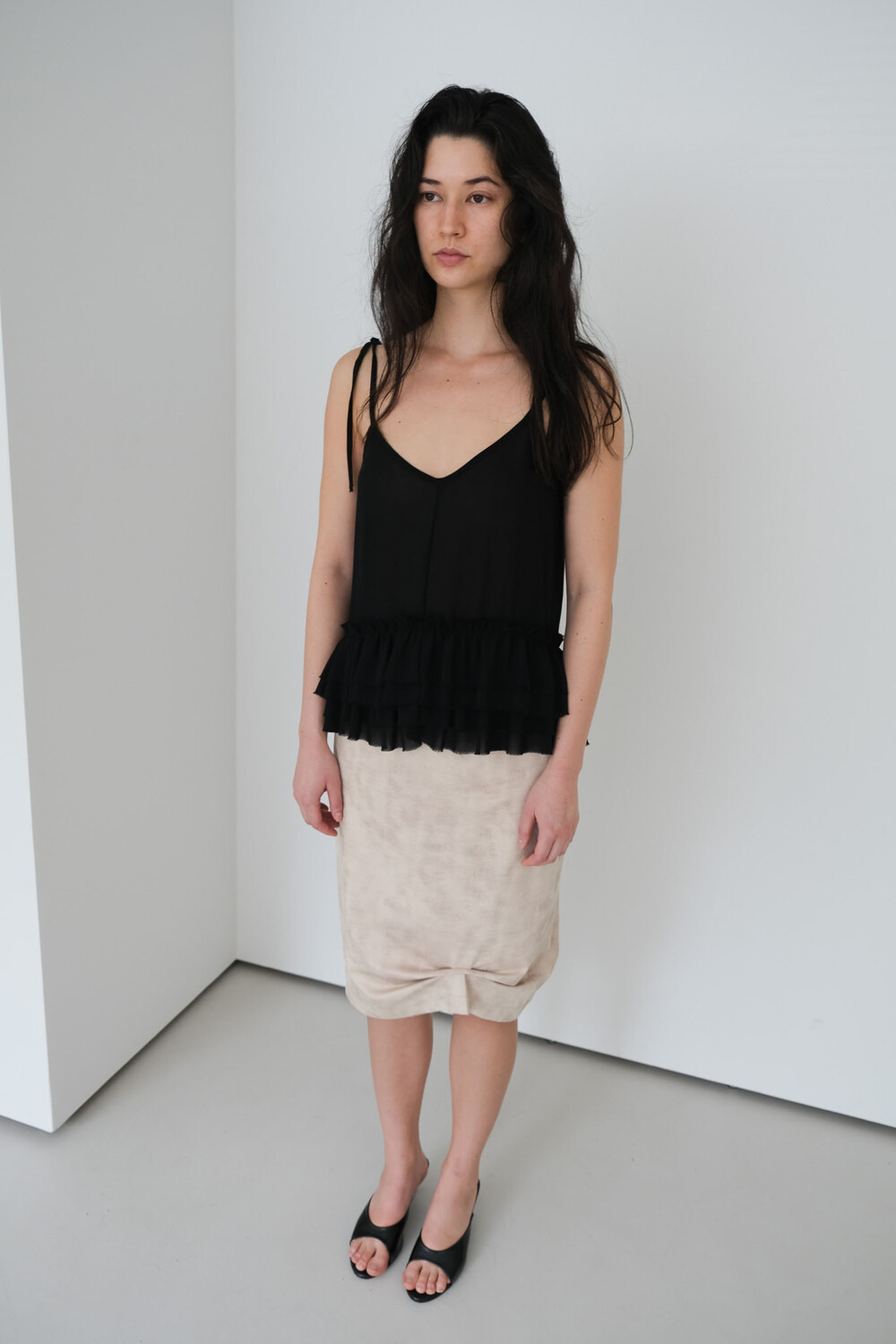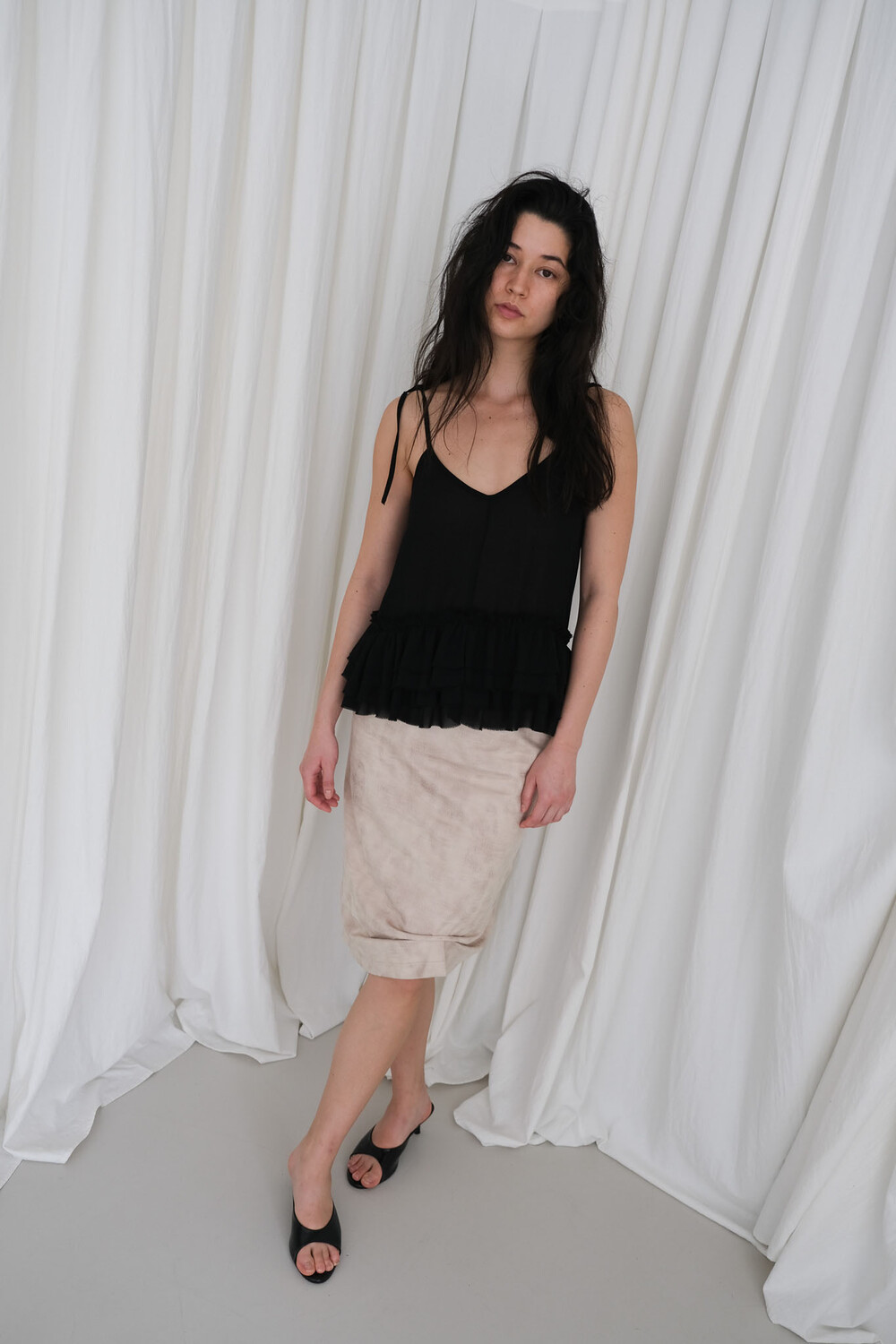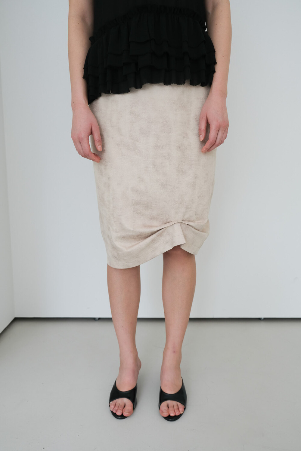 Description 아방가르드한 무드가 돋보이는 미디 스커트입니다. 레더와 스웨이드 그 중간의 오묘하고 매력적인 텍스처로 스커트 하나만으로 포인트가 되어집니다. 입체감이 느껴지는 핏으로 디자인되었으며 부담스럽지 않은 볼륨감 있는 H라인 실루엣을 만들어 줍니다. 앞 뒤 다른 위치의 핀턱 디테일로 투웨이로 활용해 볼 수 있으며 후면 콘솔 지퍼로 입고 벗기가 수월합니다. 봄/가을/겨울 다양한 룩의 포인트 아이템으로 활용해 보기 좋습니다. S/M 두 사이즈 준비되어 있습니다.