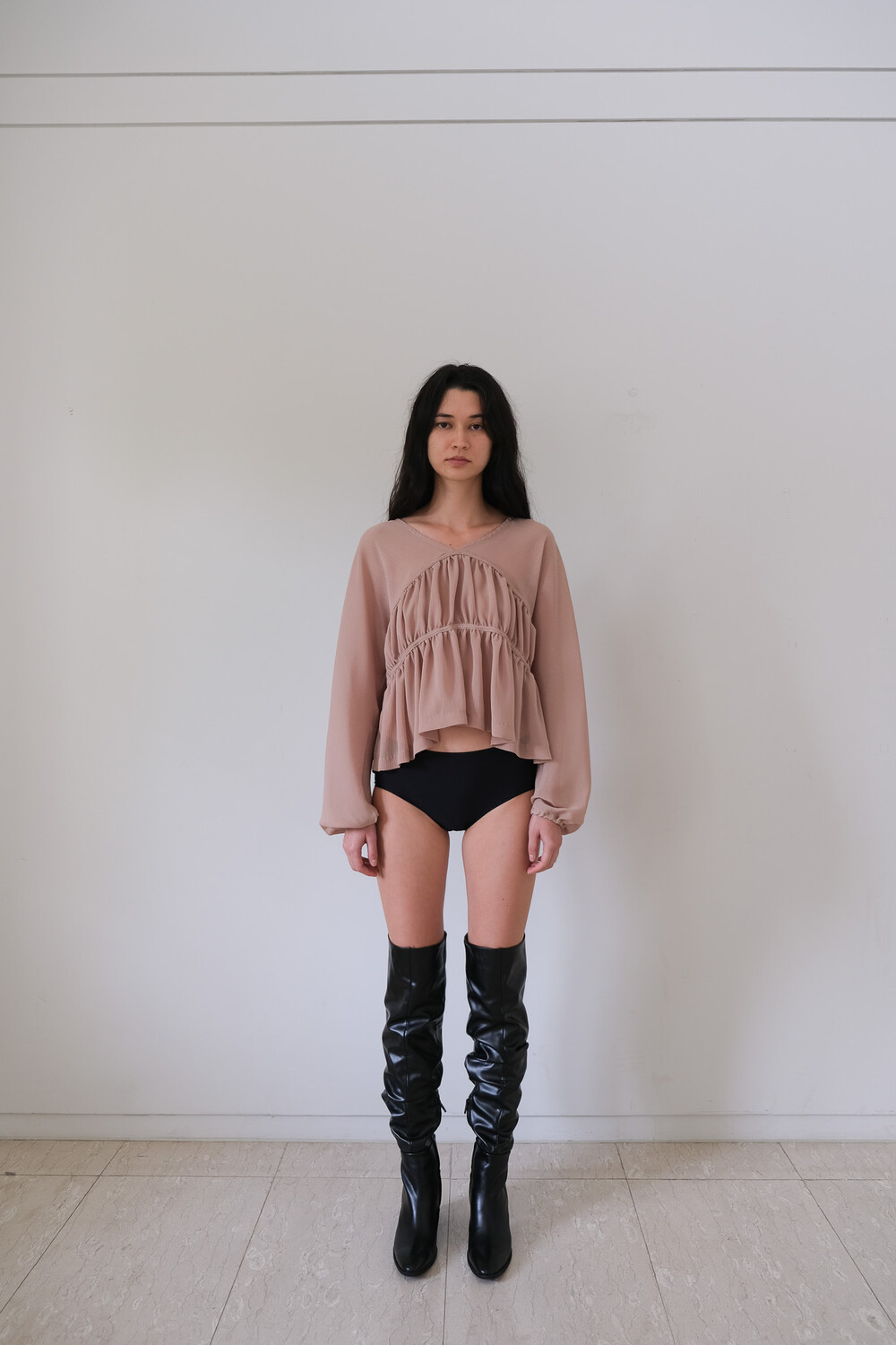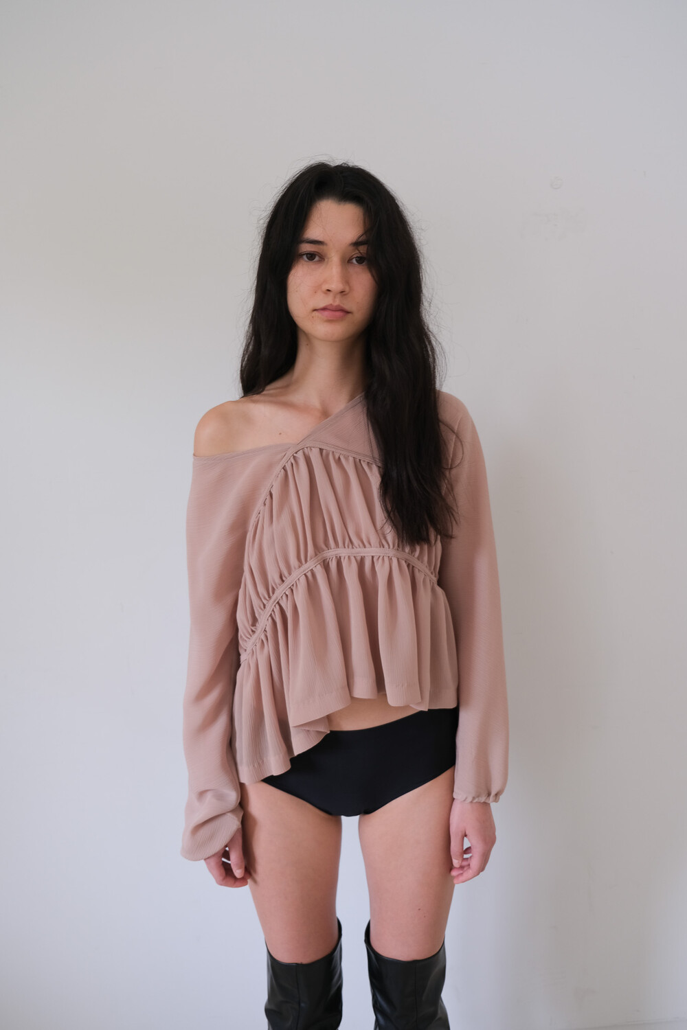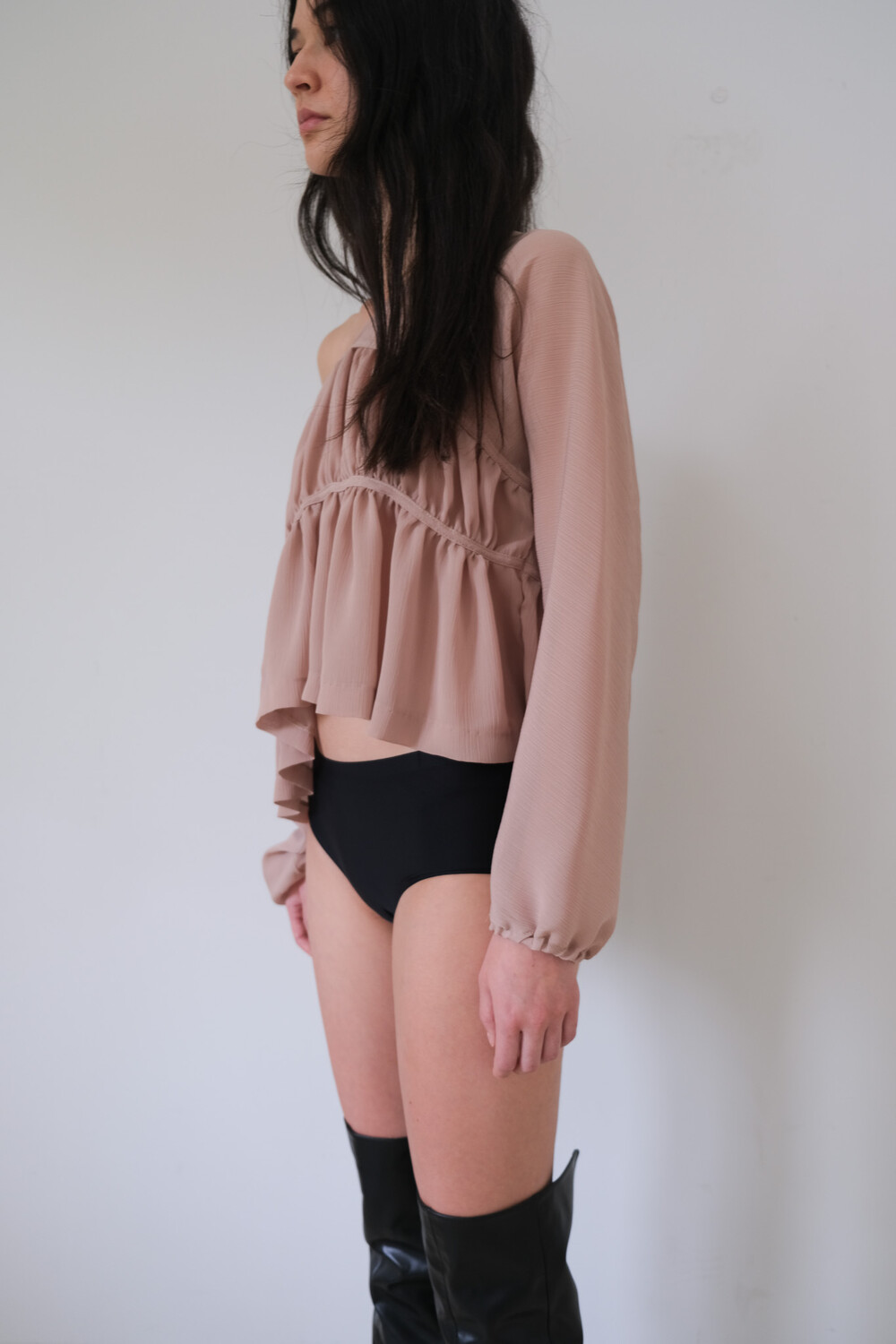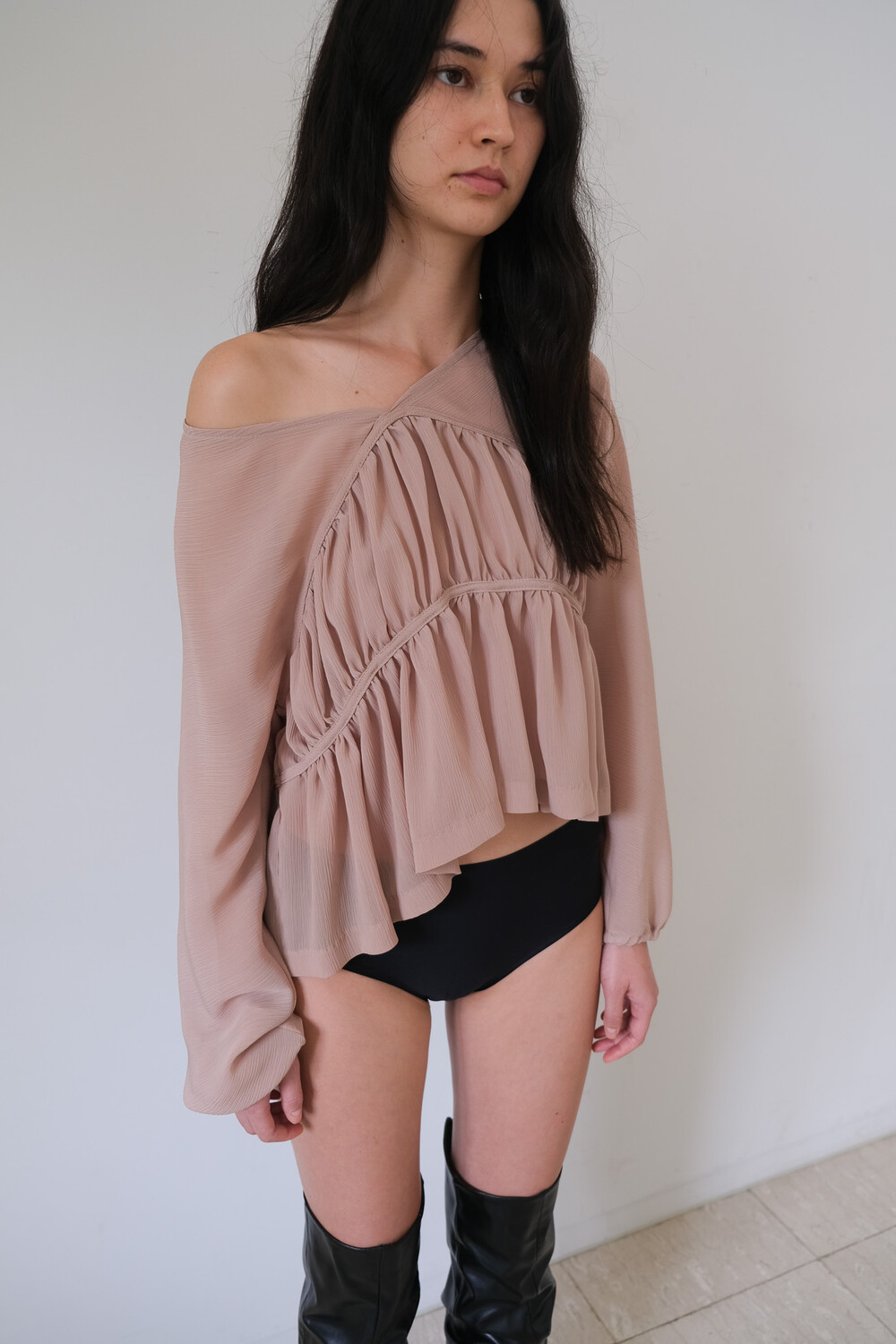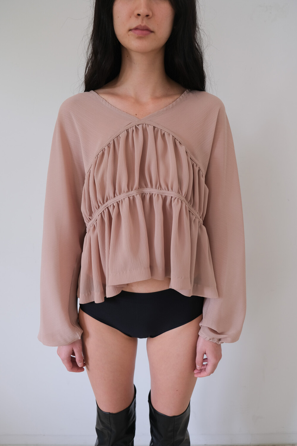 Description 우아함이 느껴지는 셔링 디테일과 은은한 비침의 시스루 원단으로 만들어진 블라우스입니다. 소매에 밴딩을 넣어 볼륨감을 더해주었으며 전체적으로 여유롭고 루즈한 핏으로 착용 시 여리여리한 실루엣이 연출됩니다. 과하지 않은 브이넥 파임으로 따로 클로징 디테일은 없으며 한쪽 숄더를 내려서 착용해보실 수 있습니다. 시즌 리스한 아이템으로 다양한 아이템과 활용해보기 좋습니다.