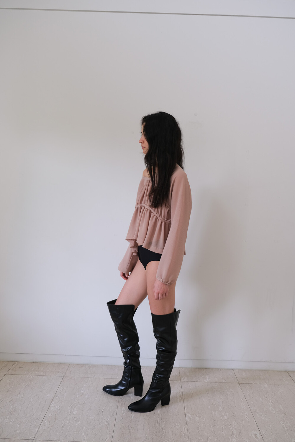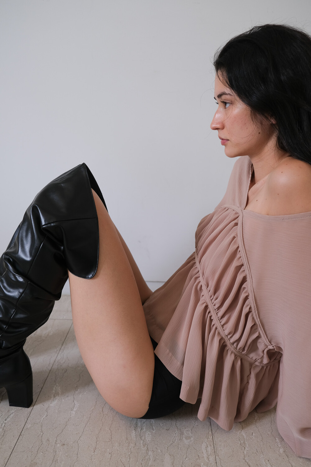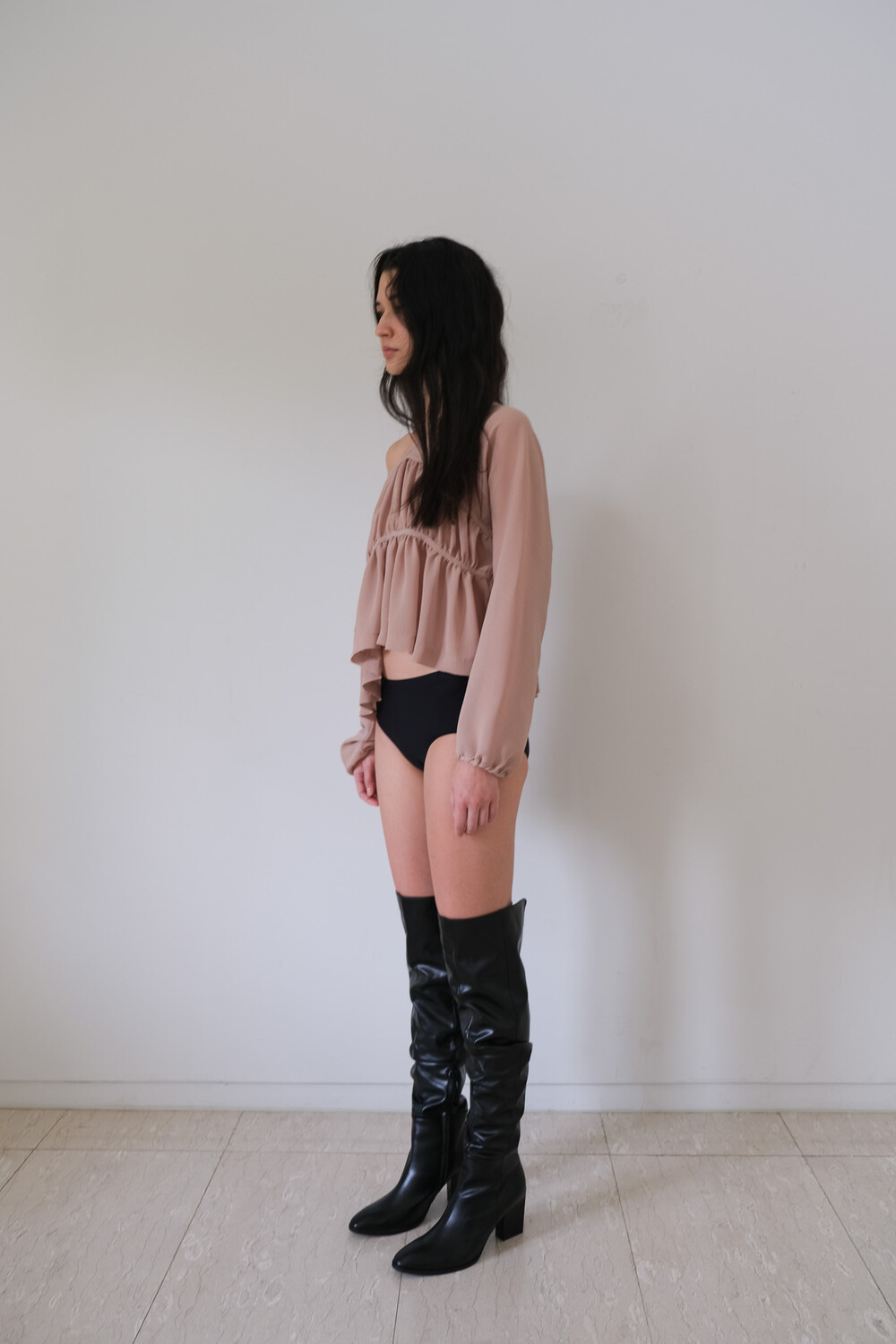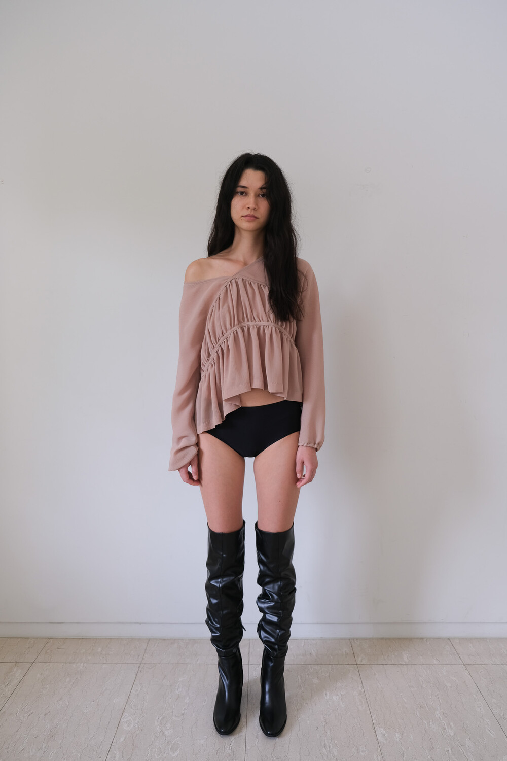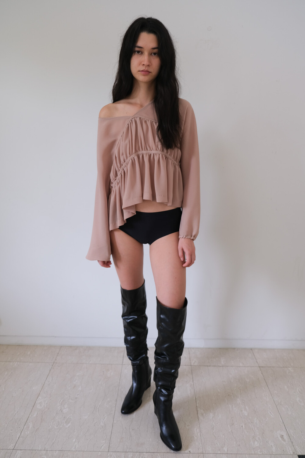 Description 우아함이 느껴지는 셔링 디테일과 은은한 비침의 시스루 원단으로 만들어진 블라우스입니다. 소매에 밴딩을 넣어 볼륨감을 더해주었으며 전체적으로 여유롭고 루즈한 핏으로 착용 시 여리여리한 실루엣이 연출됩니다. 과하지 않은 브이넥 파임으로 따로 클로징 디테일은 없으며 한쪽 숄더를 내려서 착용해보실 수 있습니다. 시즌 리스한 아이템으로 다양한 아이템과 활용해보기 좋습니다.