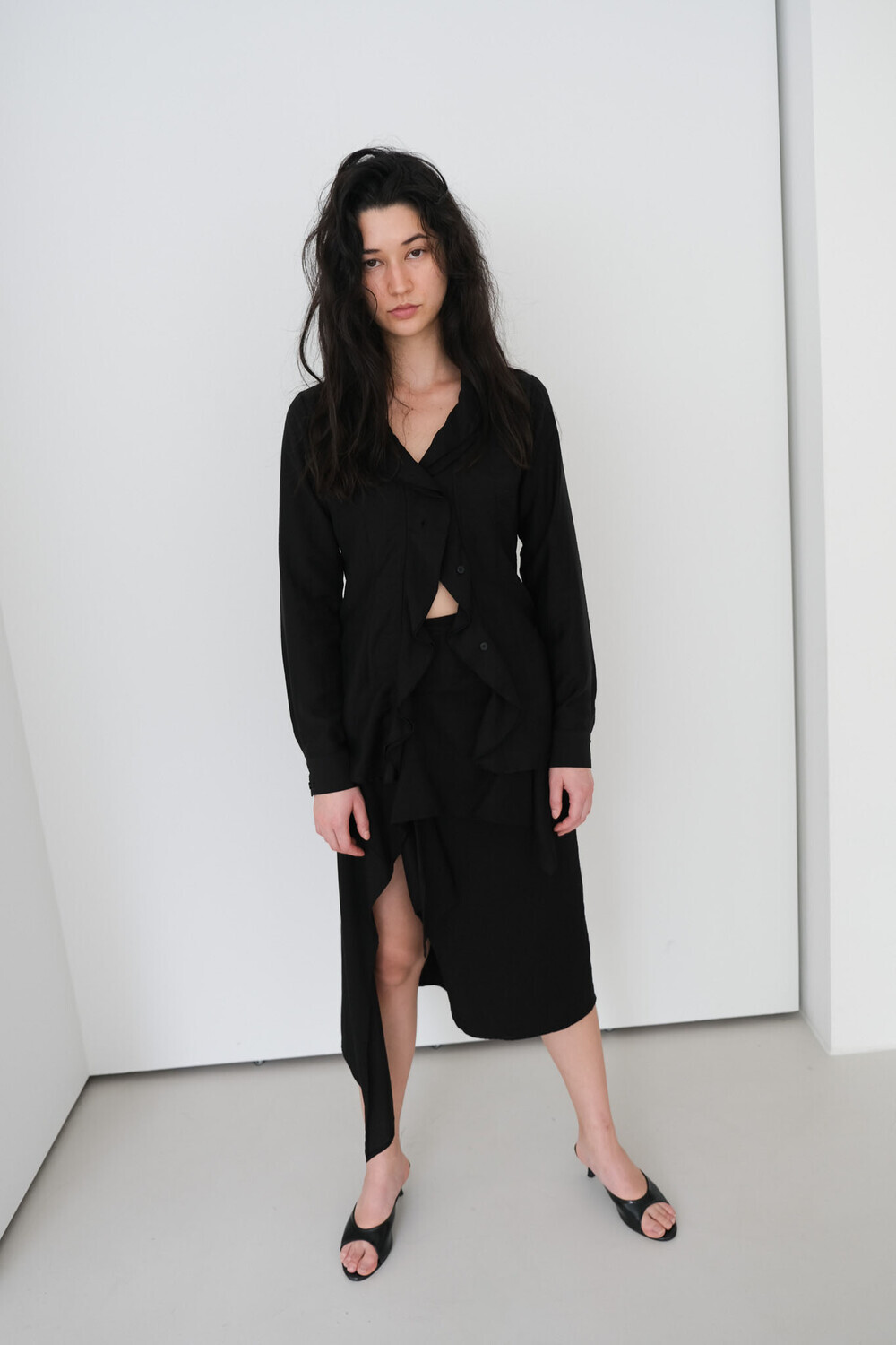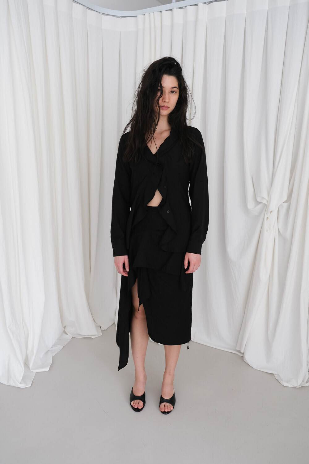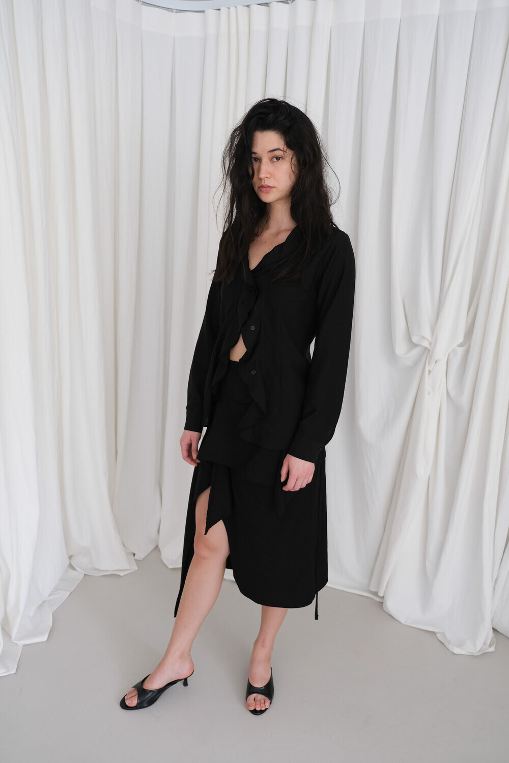 비규칙적인 언발 기장으로 디자인된 내추럴한 무드의 랩 스커트입니다. 랩 스커트 디자인으로 체형 구애 없이 착용 가능하며 코튼 혼방 소재의 담백한 텍스처로 다양한 아이템들과 함께 레이어드 해보기 좋습니다.