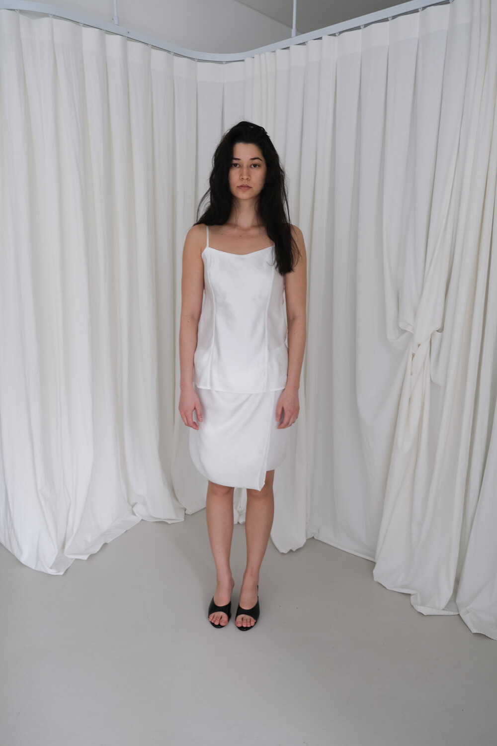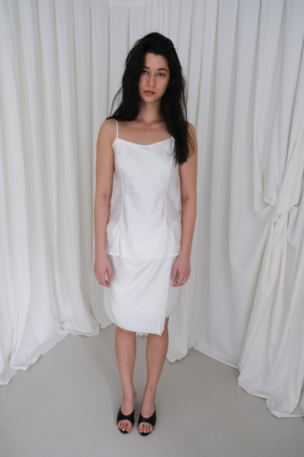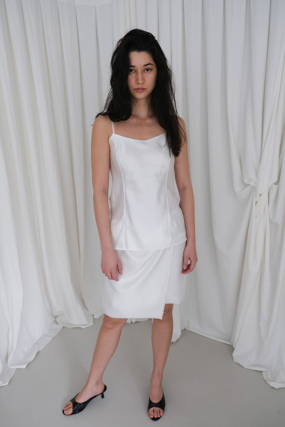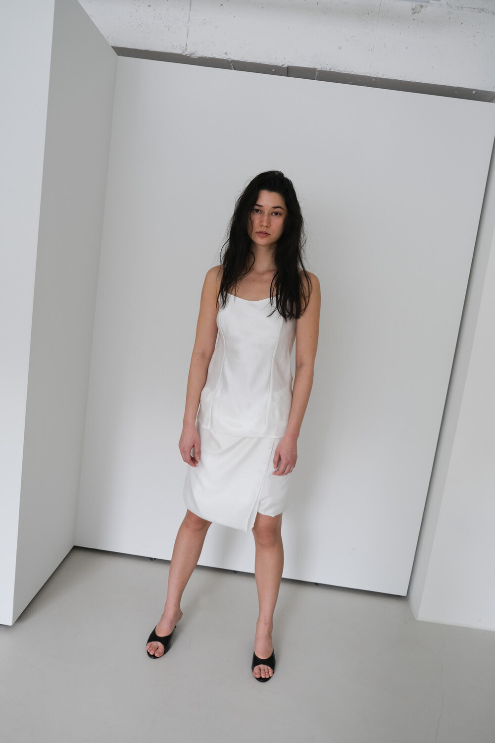 글로시하고 실키한 두 가지의 원단을 사용한 슬리브리스 탑 입니다. 같은 컬러지만 중앙, 사이드 각각 다른 텍스처를 사용하여 은은한 포인트가 느껴집니다. 허리 라인을 잡아주어 자연스러운 A라인으로 떨어지며 곡선의 아름다운 실루엣이 연출됩니다. 적당한 파임의 넥 라인과 암홀로 단독으로 착용하기 좋습니다. 화이트 블랙 2가지 컬러로 구성되어 있습니다.