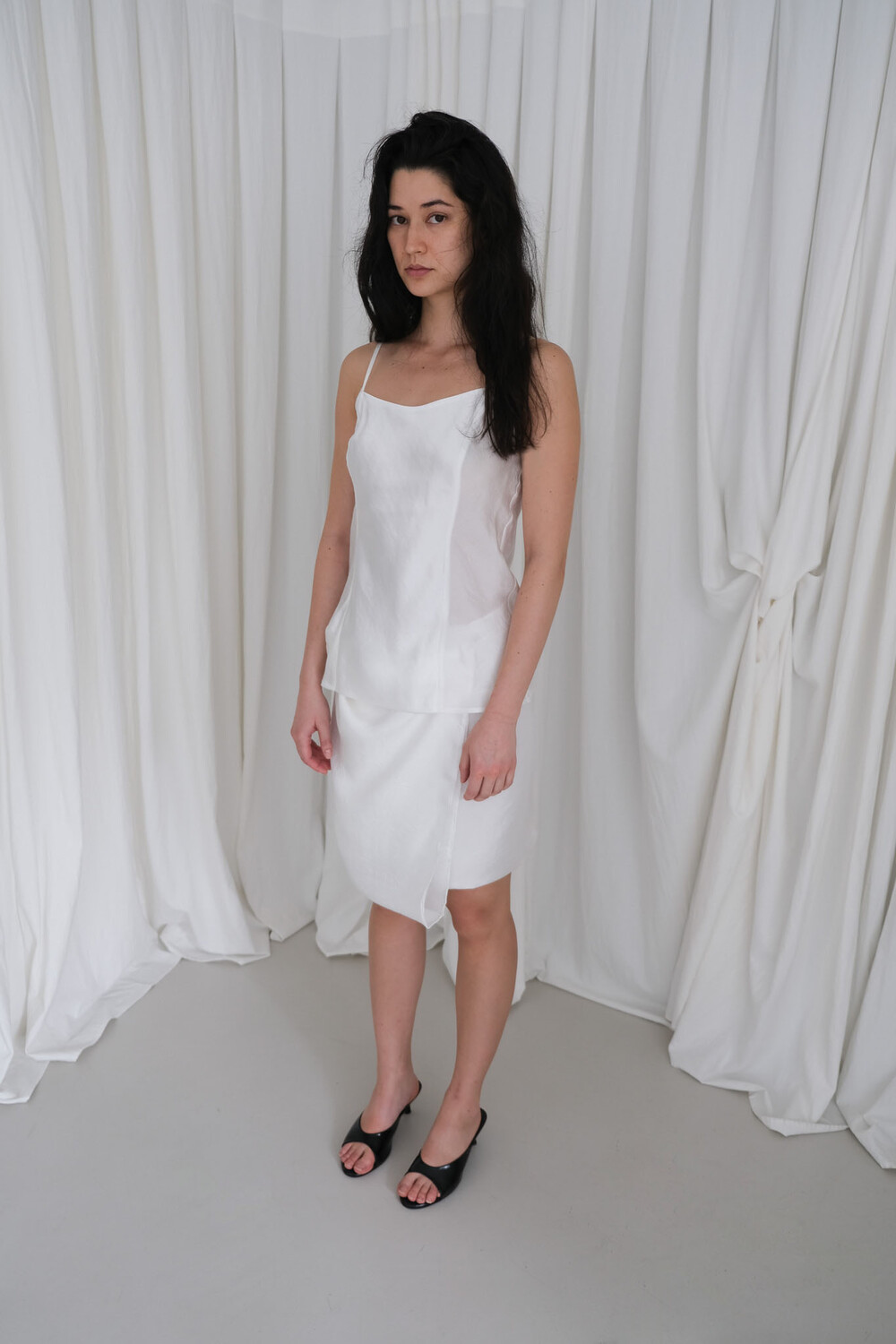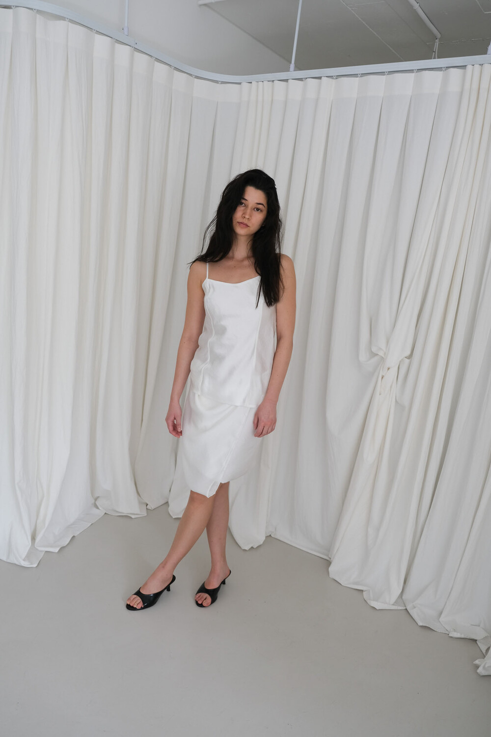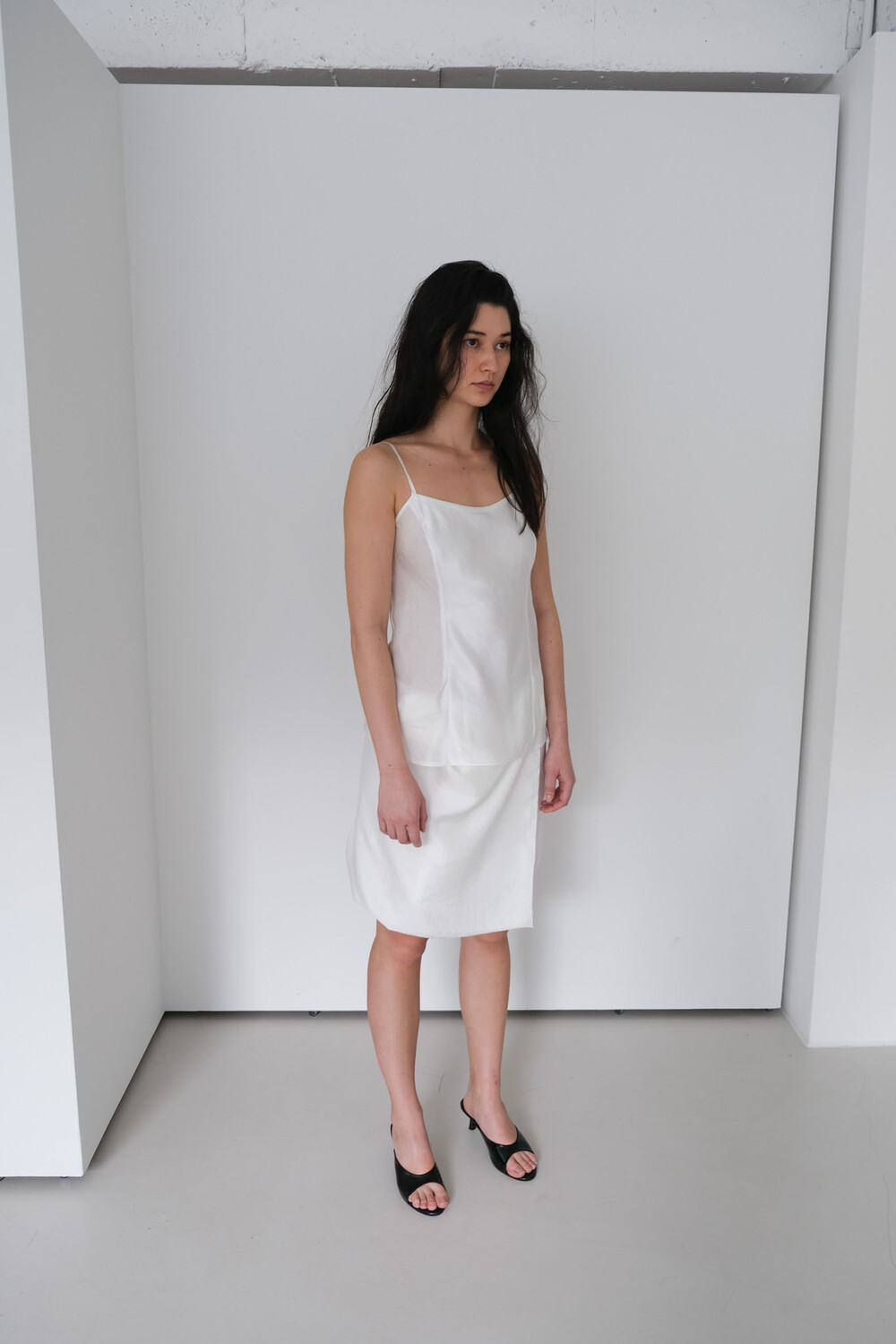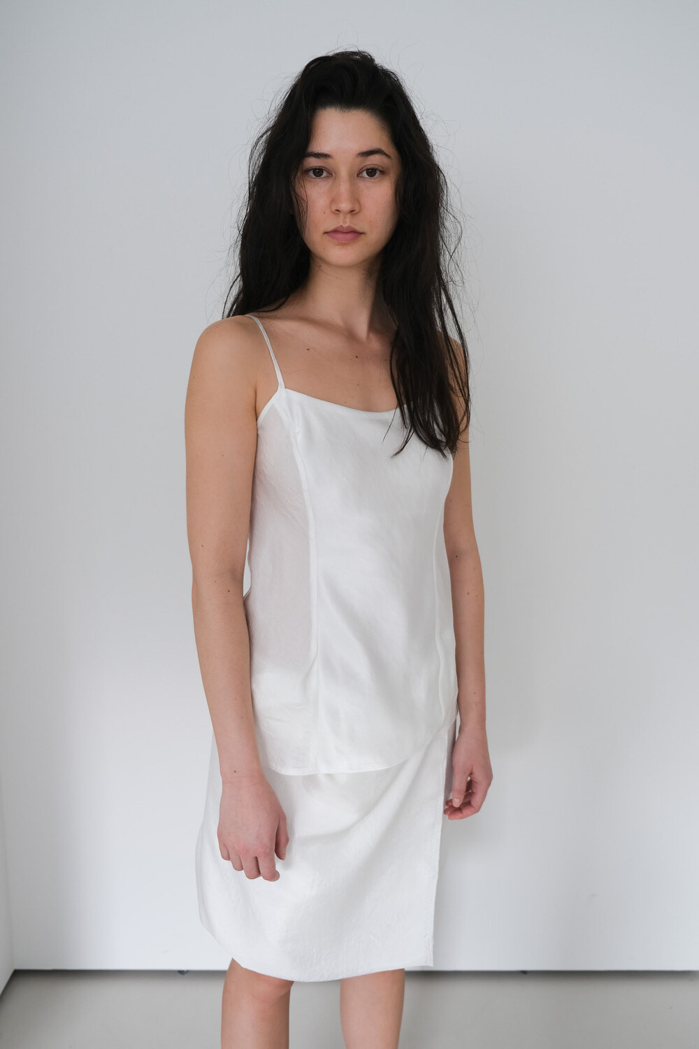 글로시하고 실키한 두 가지의 원단을 사용한 슬리브리스 탑 입니다. 같은 컬러지만 중앙, 사이드 각각 다른 텍스처를 사용하여 은은한 포인트가 느껴집니다. 허리 라인을 잡아주어 자연스러운 A라인으로 떨어지며 곡선의 아름다운 실루엣이 연출됩니다. 적당한 파임의 넥 라인과 암홀로 단독으로 착용하기 좋습니다. 화이트 블랙 2가지 컬러로 구성되어 있습니다.
