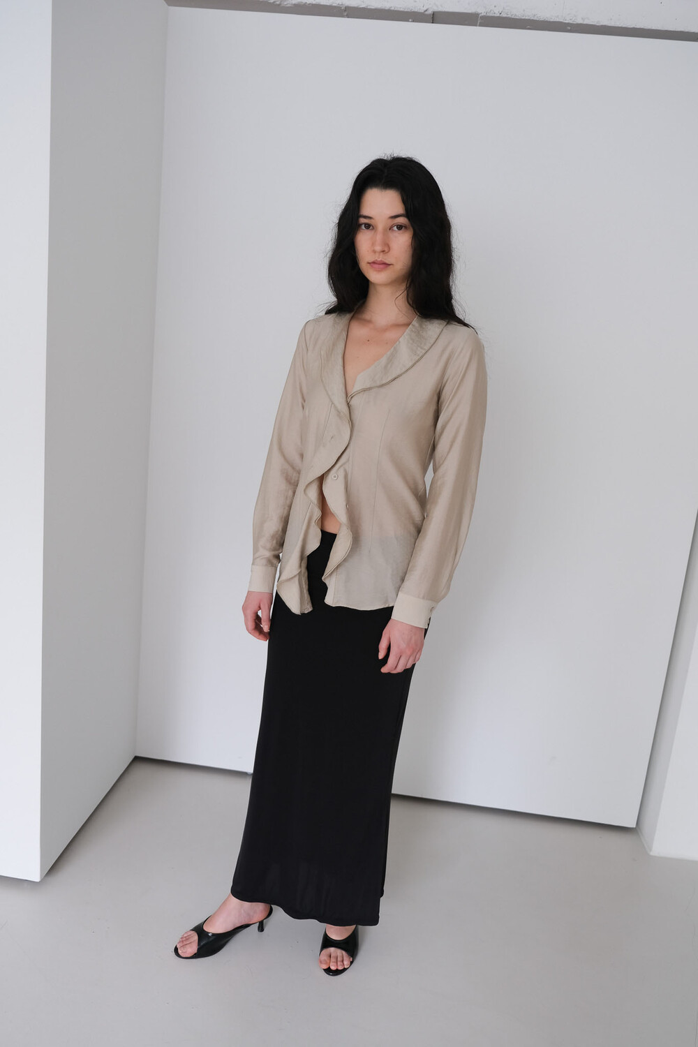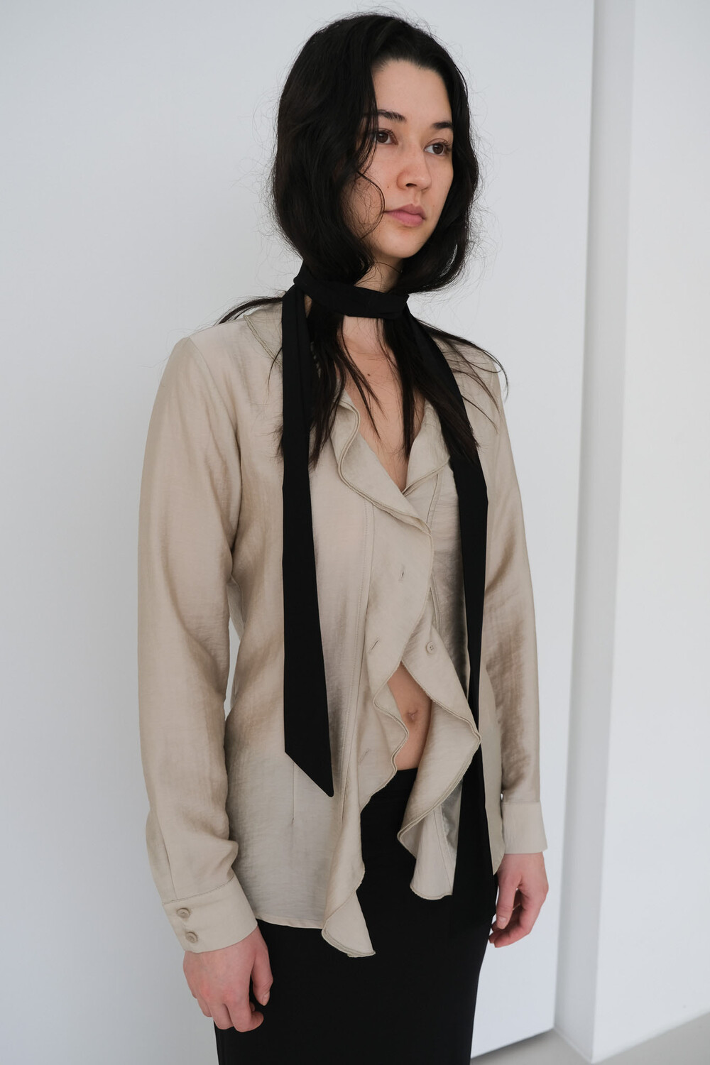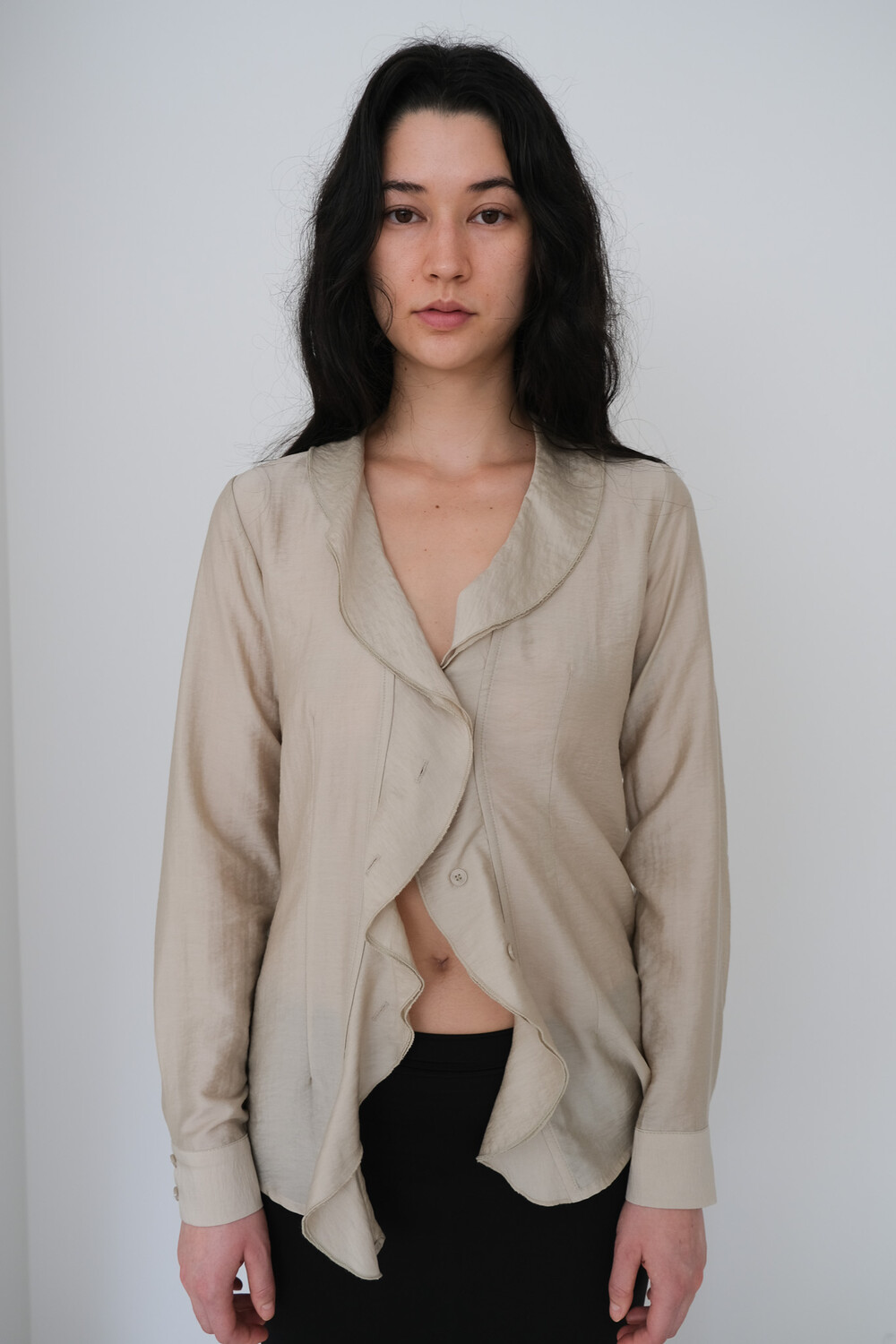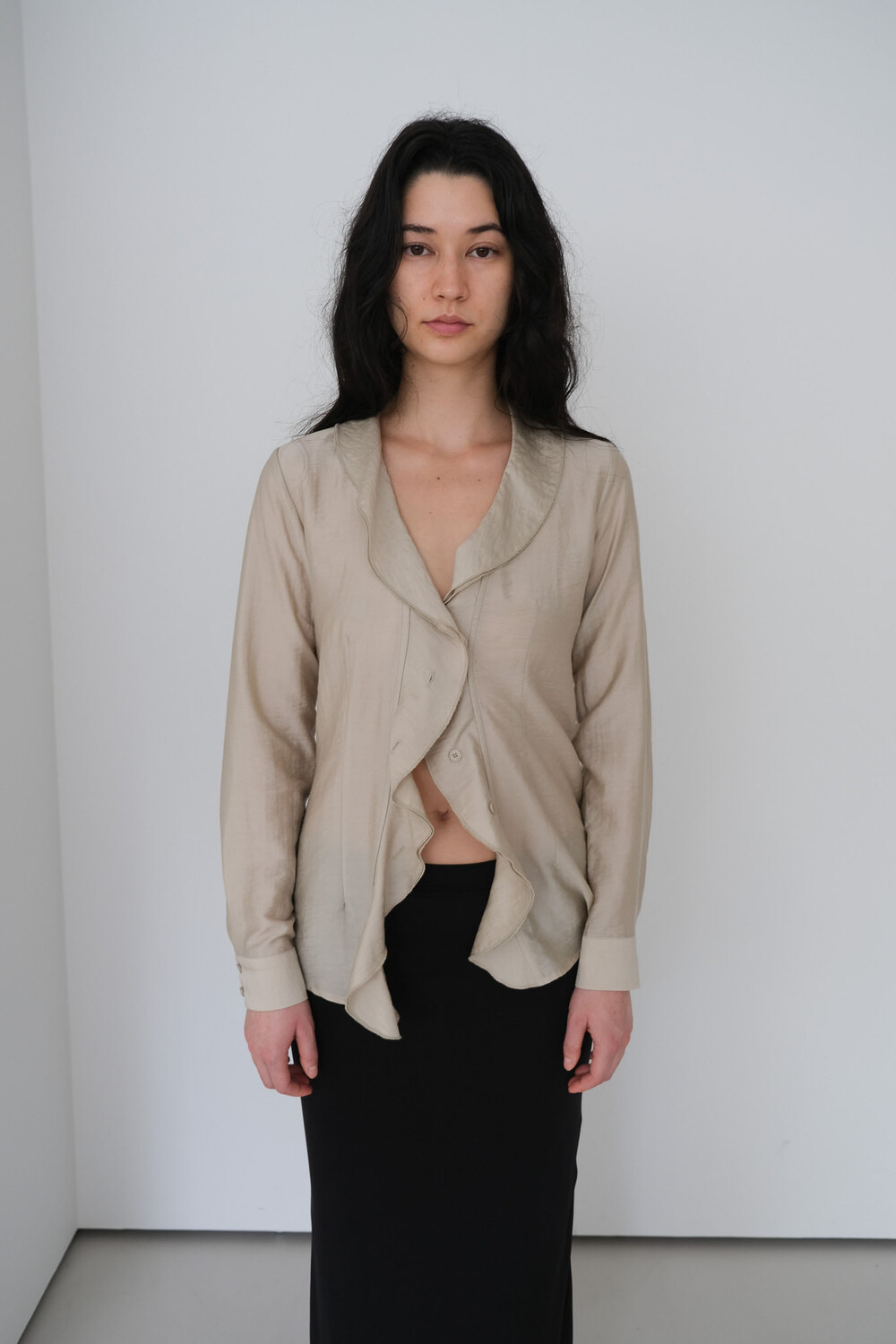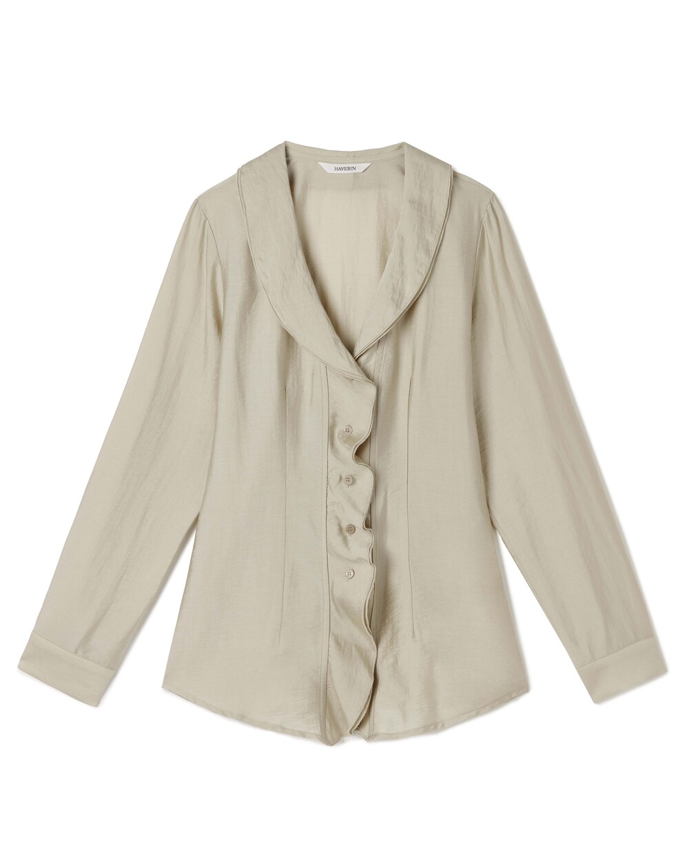 Description 러플 블라우스입니다. 넥 라인과 앞면 버튼 플래킷의 러플 디테일은 블라우스 특유의 우아한 분위기를 자아냅니다. 곡선 형태의 절개 디테일로 허리 라인을 잡아주어 자연스러운 A라인의 아름다운 실루엣이 연출됩니다. 블라우스 외에도 단추를 모두 오픈하여 자켓 느낌으로도 활용해 보실 수 있습니다. 캐주얼한 데님부터 포멀한 슬랙스 스커트까지 다양한 무드로 활용해 보실 수 있습니다. 베이지 블루 블랙 3가지 컬러로 구성되어 있습니다.
