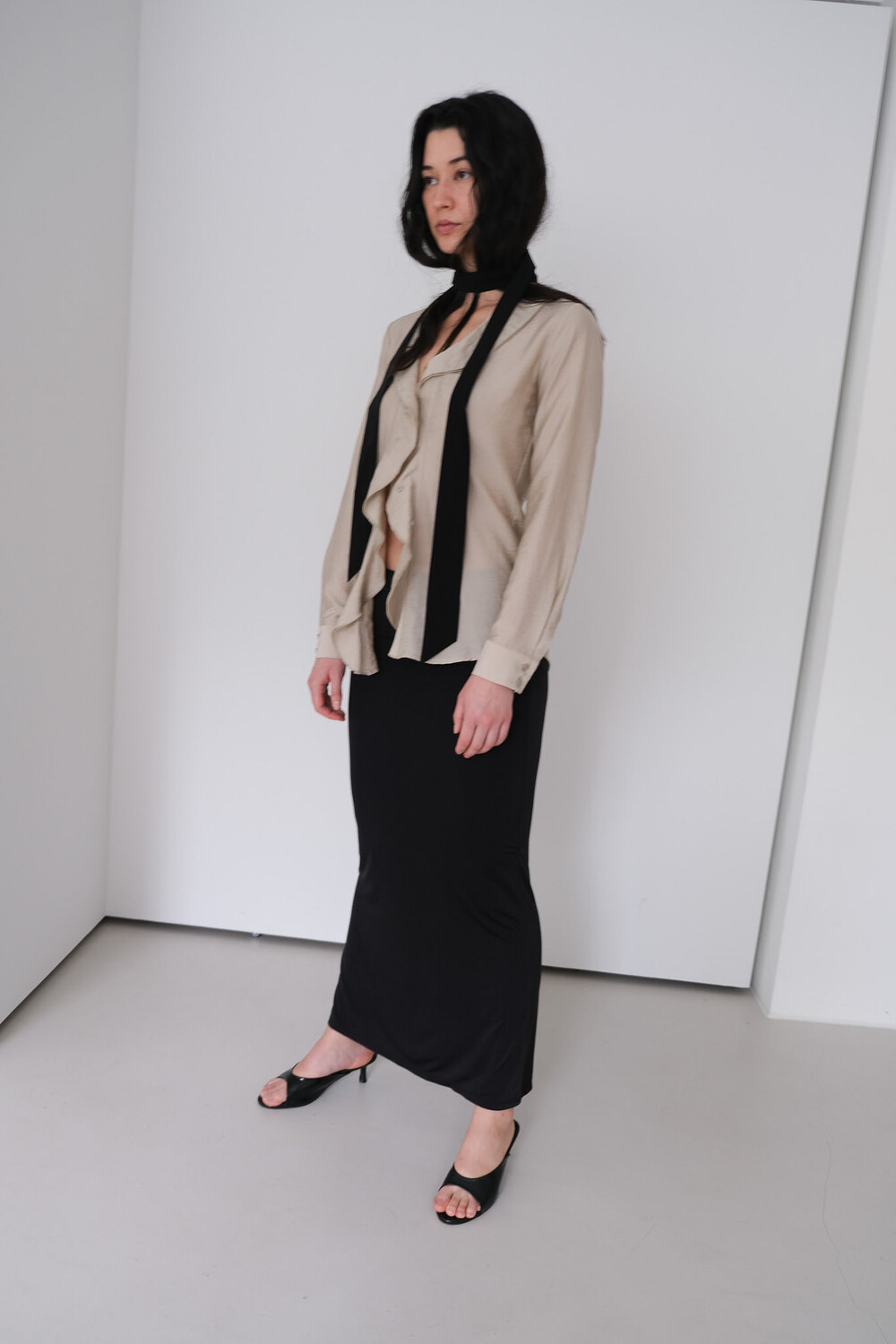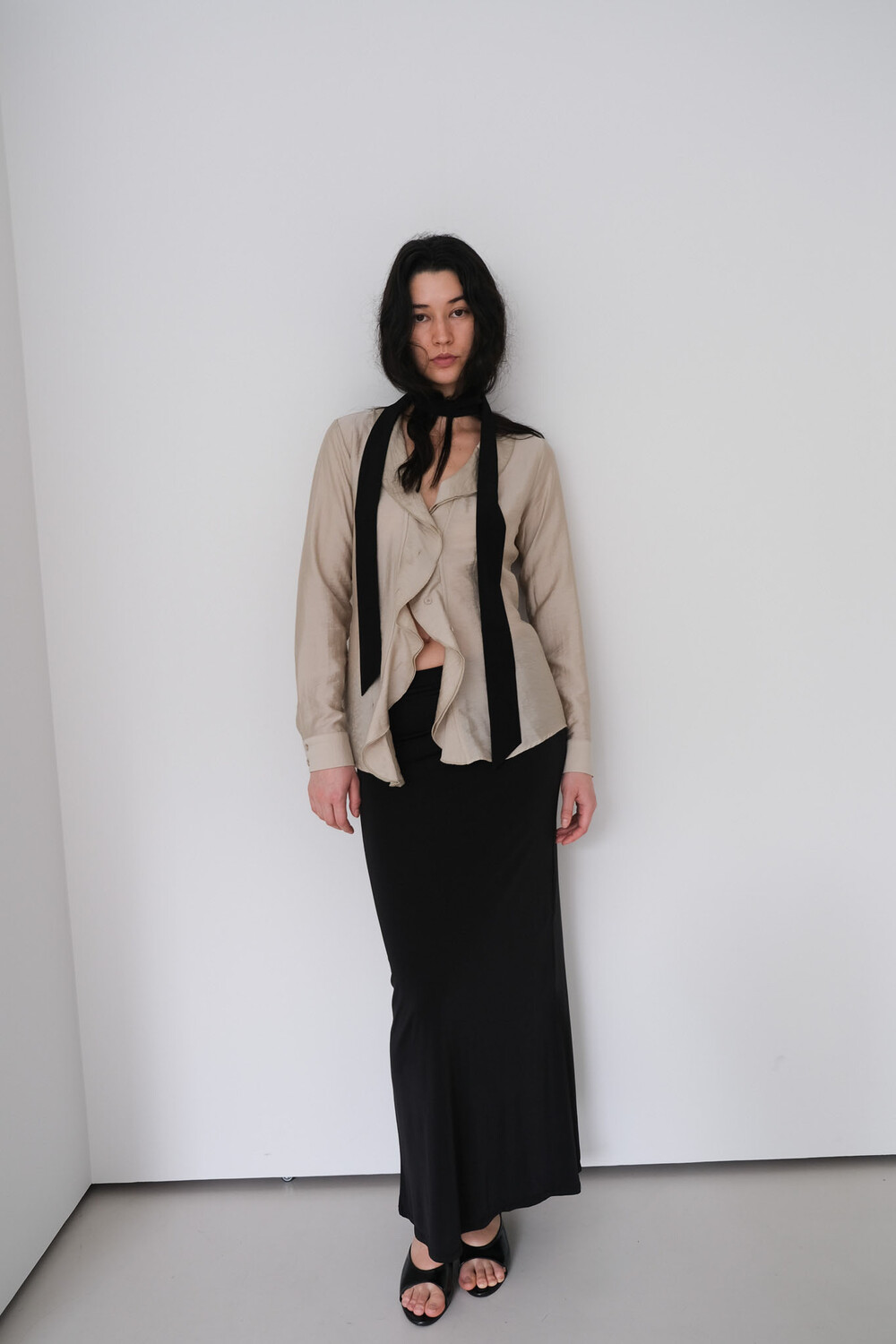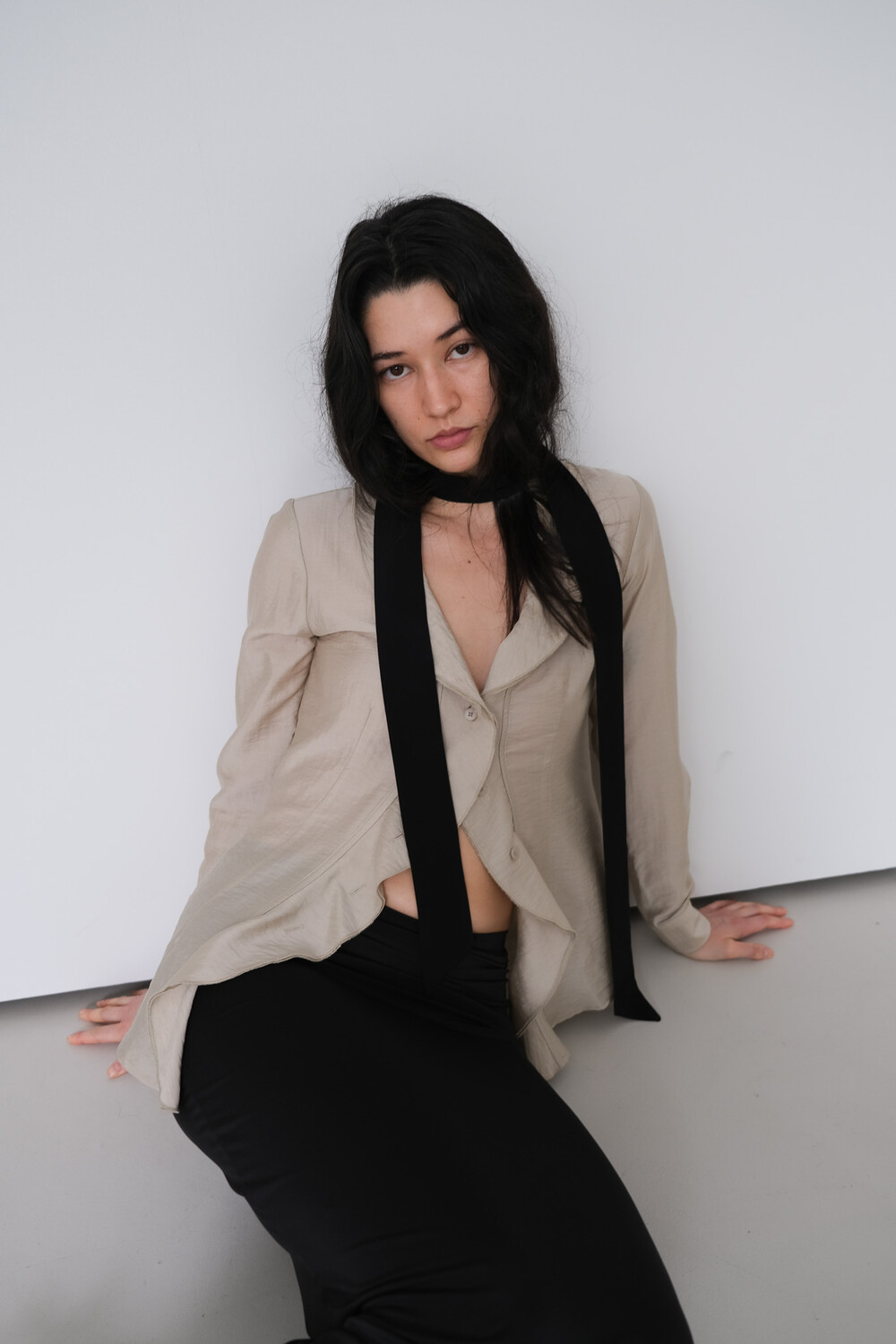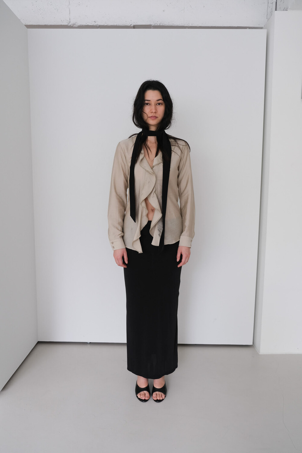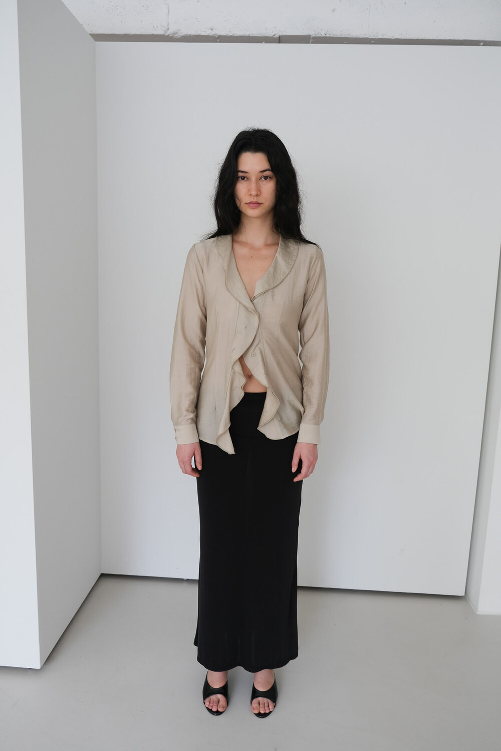 Description 러플 블라우스입니다. 넥 라인과 앞면 버튼 플래킷의 러플 디테일은 블라우스 특유의 우아한 분위기를 자아냅니다. 곡선 형태의 절개 디테일로 허리 라인을 잡아주어 자연스러운 A라인의 아름다운 실루엣이 연출됩니다. 블라우스 외에도 단추를 모두 오픈하여 자켓 느낌으로도 활용해 보실 수 있습니다. 캐주얼한 데님부터 포멀한 슬랙스 스커트까지 다양한 무드로 활용해 보실 수 있습니다. 베이지 블루 블랙 3가지 컬러로 구성되어 있습니다.