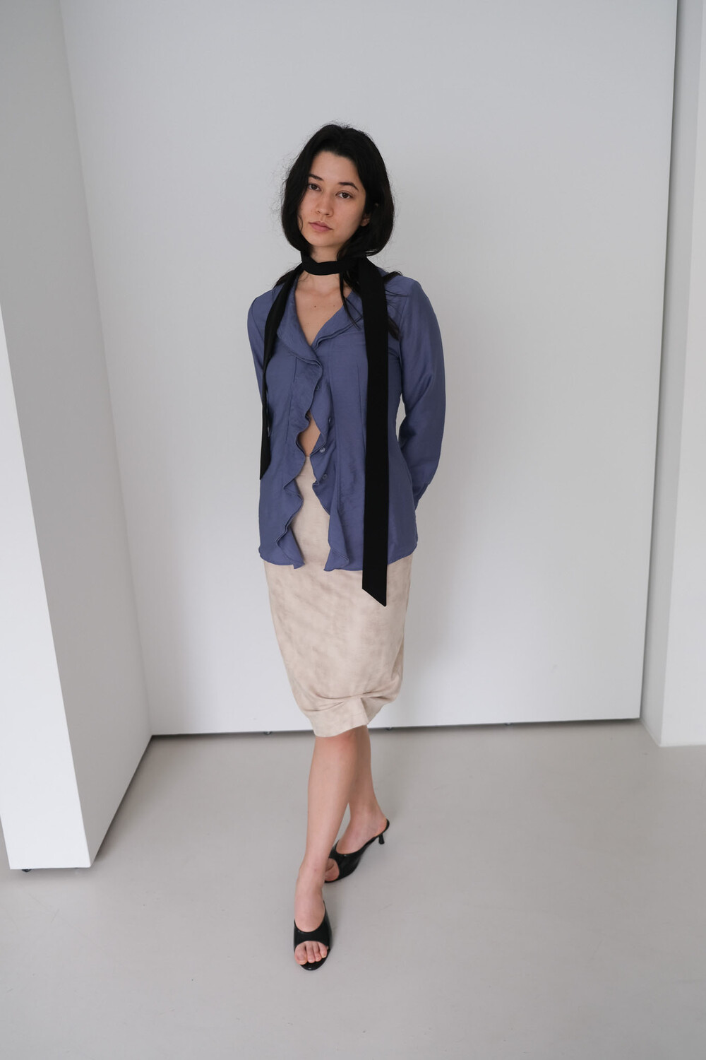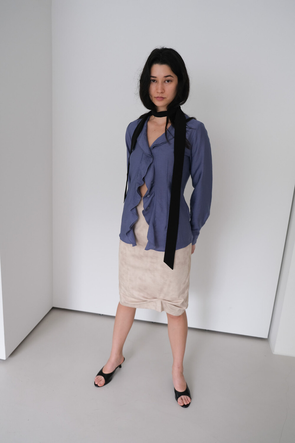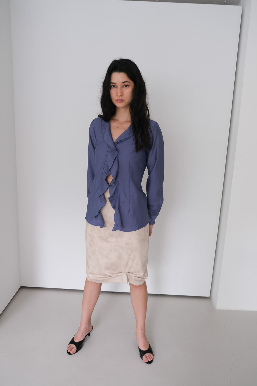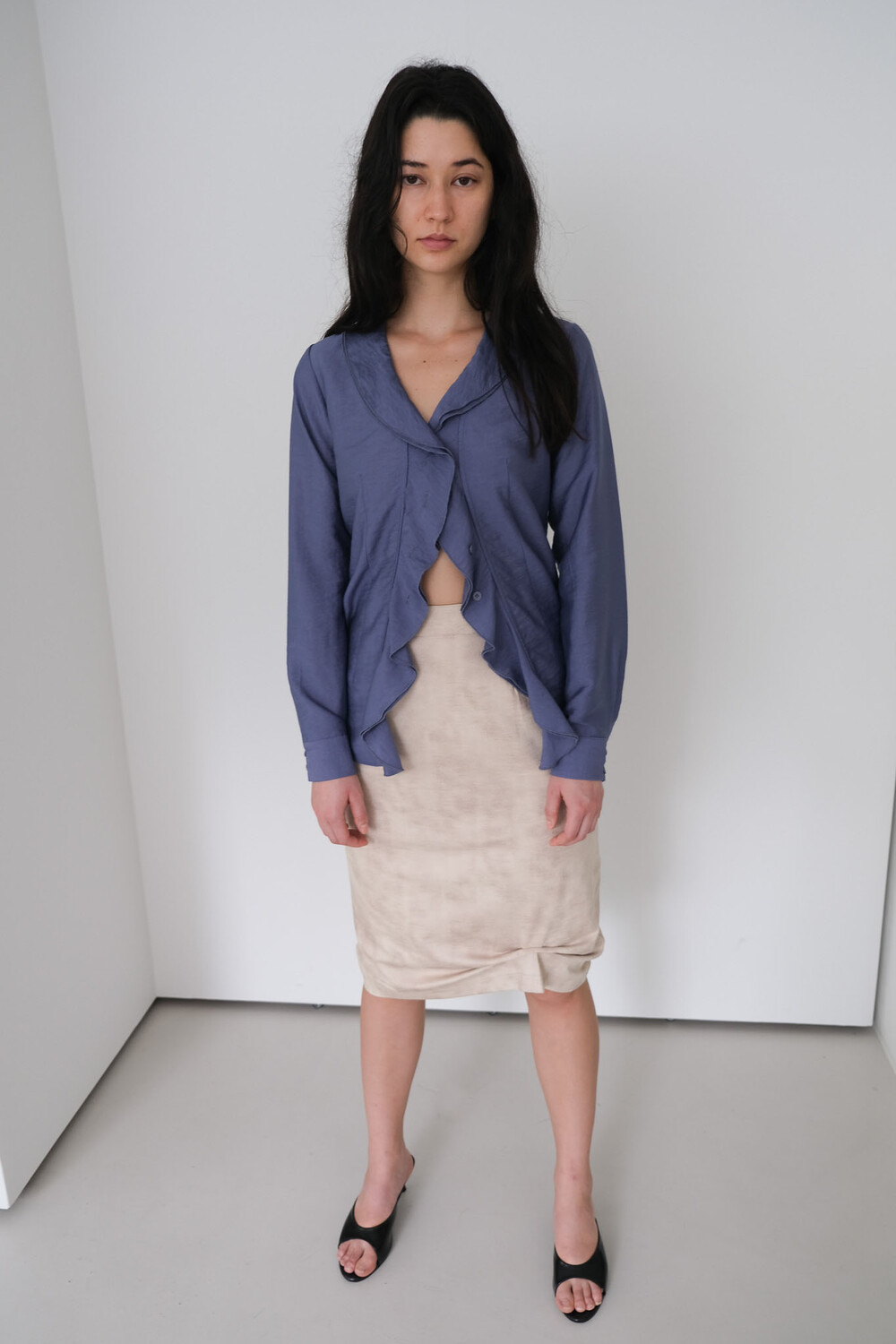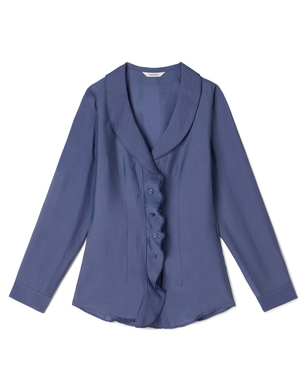Description 러플 블라우스입니다. 넥 라인과 앞면 버튼 플래킷의 러플 디테일은 블라우스 특유의 우아한 분위기를 자아냅니다. 곡선 형태의 절개 디테일로 허리 라인을 잡아주어 자연스러운 A라인의 아름다운 실루엣이 연출됩니다. 블라우스 외에도 단추를 모두 오픈하여 자켓 느낌으로도 활용해 보실 수 있습니다. 캐주얼한 데님부터 포멀한 슬랙스 스커트까지 다양한 무드로 활용해 보실 수 있습니다. 베이지 블루 블랙 3가지 컬러로 구성되어 있습니다.
