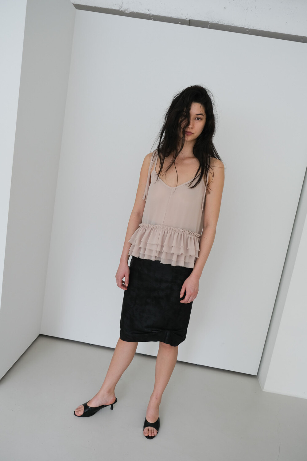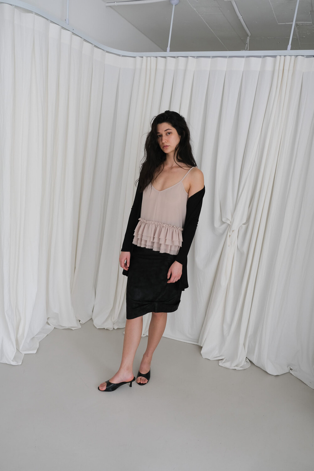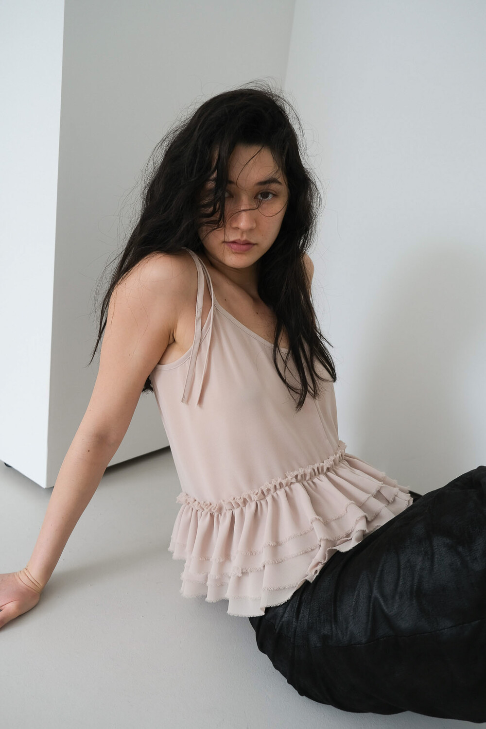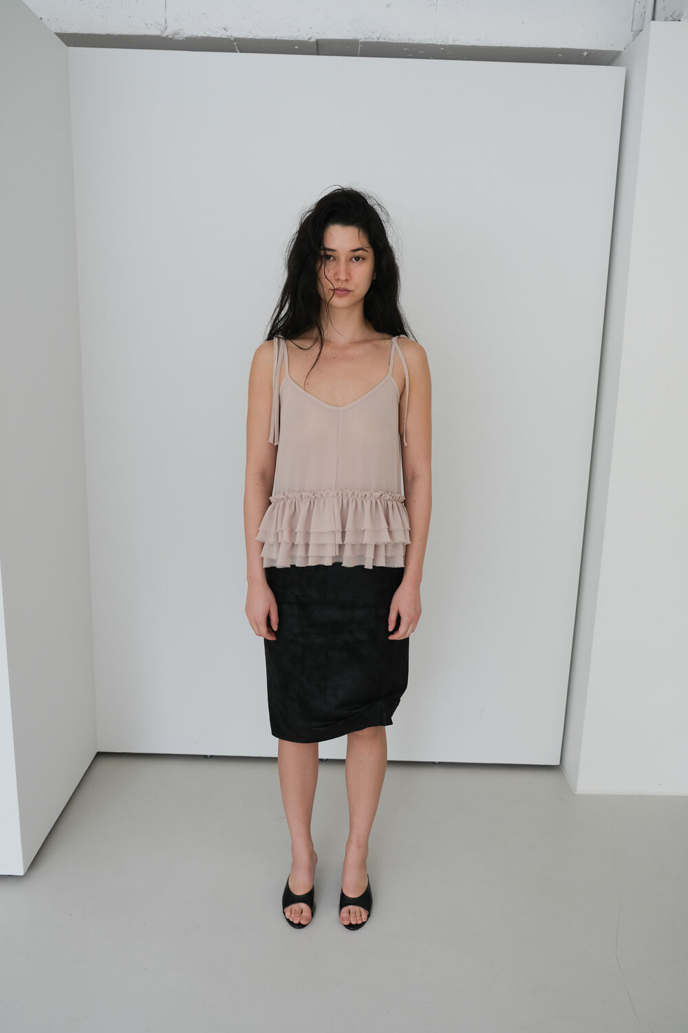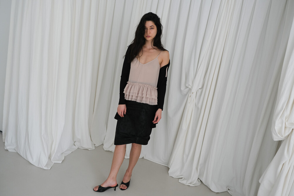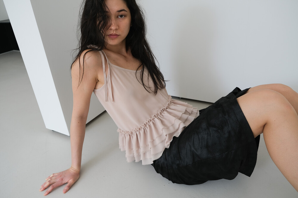 프릴 슬리브리스 탑입니다. 묶는 형식의 어깨 끈으로 길이 조절은 물론 다양한 연출이 가능합니다. 러블리한 프릴 디테일과 상반되는 느낌으로 밑단과 어깨 끈의 끝은 자연스럽게 풀어지는 러프한 마감 처리하였습니다. 시어한 소재감으로 약간의 비침은 있으며 레이어드 착용을 권장드립니다. 여름철 포인트 아이템으로 활용해 보실 수 있습니다. 베이지 블랙 2가지 컬러로 구성되어 있습니다.
